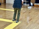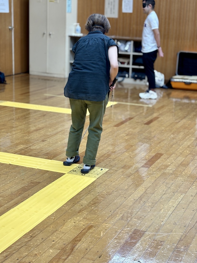 アイマスクをして白杖を待ち、杖先の感覚と足の裏の感触を頼りに床に敷かれた点字ブロックの上を歩いて速さを競う競技。