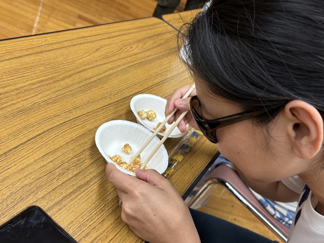 椅子に座ってお箸を持って、片方の皿に入れられたポップコーンをもう一つの皿に移す競技。丸い物ががあるのは分かるけど、お箸でつまむのは勘だけが頼りなので難しい。