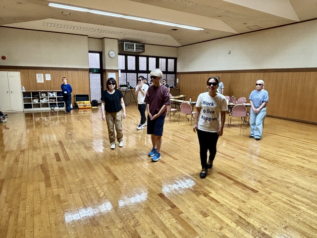 眼鏡をかけて真っ直ぐ歩き、自分が5mと思う場所で止まり、距離を測定。一番近い人が勝ちという競技。