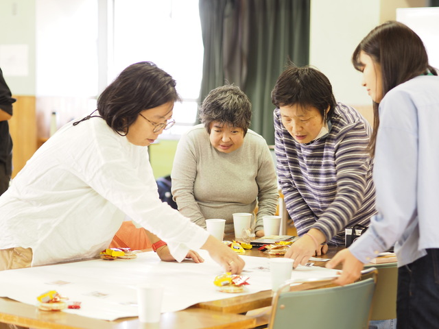 こちらのチームの最終目的地は、最近新しくできた公共施設。スタート地点からはちょっと遠くて道も複雑ですが、きょうこさんは最近まで住んでいた地元ということで、地図を見ることなく、迷わずスイスイ進んで案内してくれます。「すごい!」「頼りになる!」と言われながら、ある銭湯の前へ。「ここは昔よく行ったんですよ〜」と銭湯の前でピース。写真に撮ろうとすると、後ろから「あれ?きょうこちゃん!」と声が。ばったりお友達に遭遇しました!銭湯を後にした道中も「あら、こんにちは〜!」と別のお友達とすれ違う。地元ならではの微笑ましい光景でした。