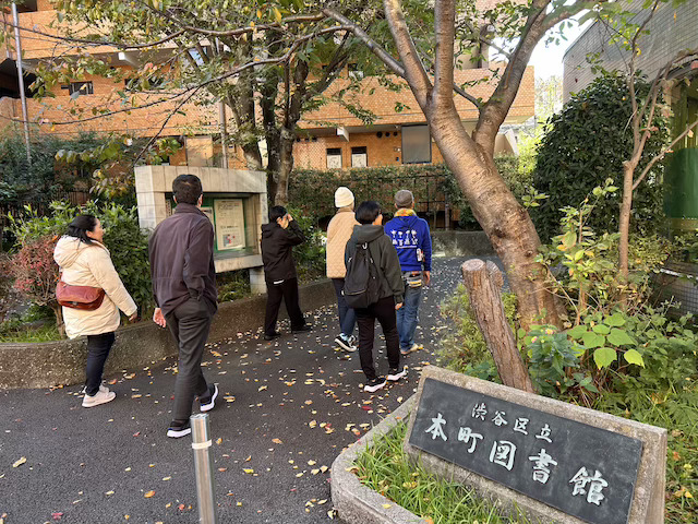 一方、初台方面のくまちゃん&みーちゃんチーム、最初の目的地は本町図書館。みーちゃんの案内で住宅街を抜けると、小さな図書館が現れました。外観はシンプルで、地域に根ざした雰囲気が漂っていると感じました。ここでは、みーちゃんから、渋谷区では図書カードをスマホで登録できるということ。参加者の間でも「便利だね」という声が上がりました。