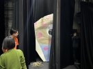 この後、劇場内に入れてもらい、バックステージツアーです。舞台の上に乗せていただき、恵比寿社会教育館で教えてもらったことを実際に確かめることができました。舞台下をのぞきこんだり、さわっちゃいけないホリゾントや黒幕、袖幕などを確認できました。上を見上げて照明類がどうなっているかを見ることもできました。舞台は思ったよりも広く感じましたが、袖が狭いために苦労も多いことがわかりました。