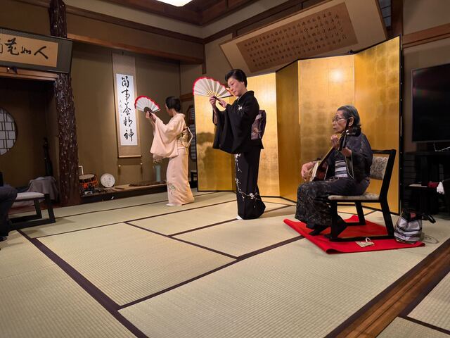 参加者のみなさんのテーブルに入り、場を盛り上げる軽妙なトーク、そして瓢屋 小糸姐さんの三味線、鼓に合わせて踊りと長唄。